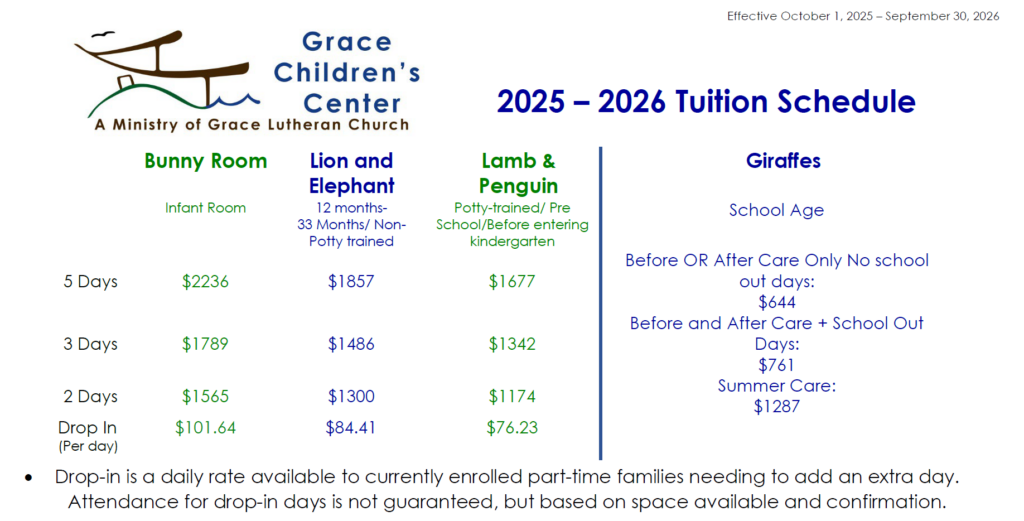 • Vacation credit equal to one week’s tuition is available after you have been enrolled for one full year. Applies to five (5) day enrollment only. Excludes – subsidy and school age.